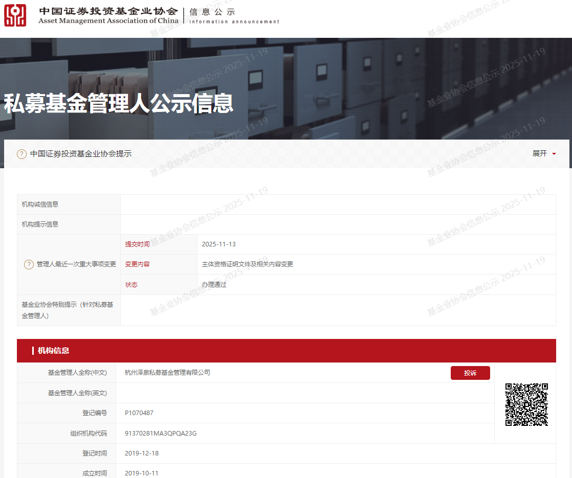 杭州泽泉私募基金管理有限公司成立于2019年10月,并于同年12月在中国证券投资基金业协会备案成为私募基金管理人。
